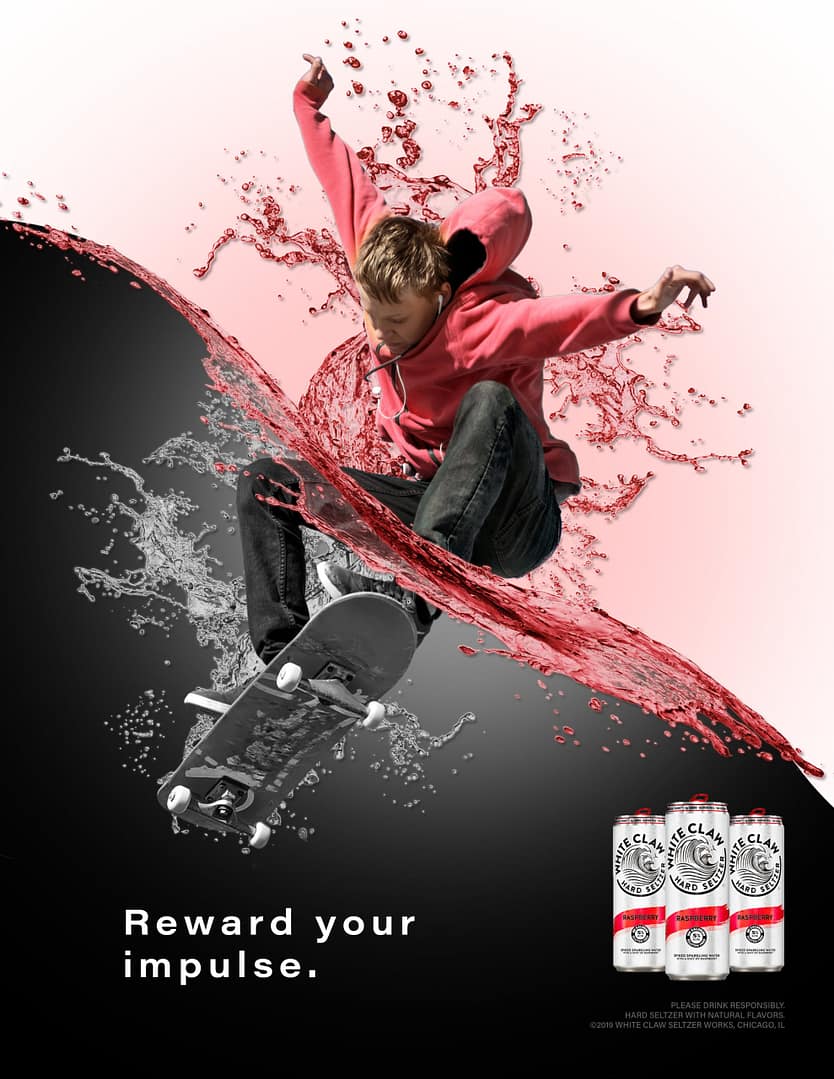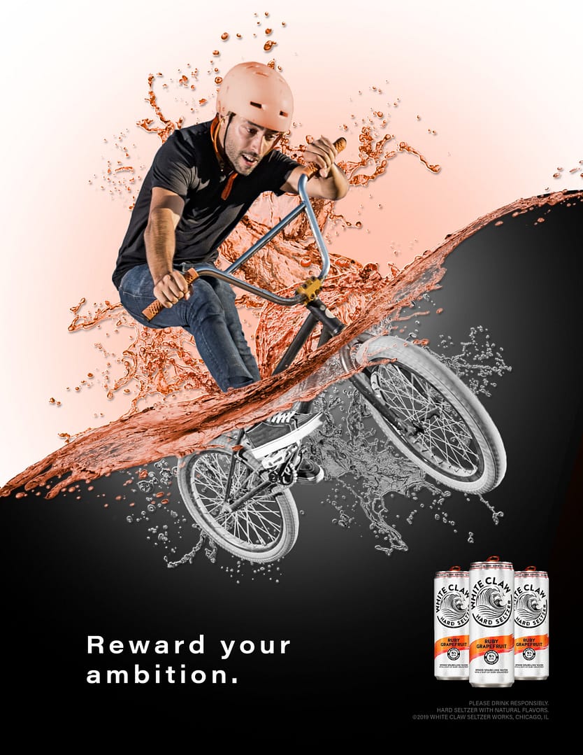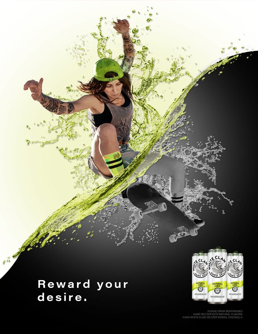 It was intentionally decided to avoid using competitive sports as the featured activity in each ad. Someone who is active is not necessarily an athlete. While all the activities featured in the ads can be competitive, they can also be casual and fun. The tagline for the ads was chosen to bring confidence to the viewer. Drinking White Claw® should be a guilt free experience. White Claw® is marketed to be a healthy alternative for alcohol. “Reward your motivation” is meant to energize the consumer, giving them the confidence to do what they love and also enjoy White Claw® Hard Seltzer, guilt free.